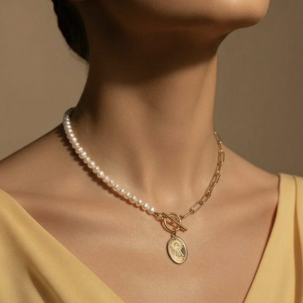 Elegante collar de la Virgen del Pilar, mezcla cadena de acero con perla de río y medalla de la patrona de Zaragoza.