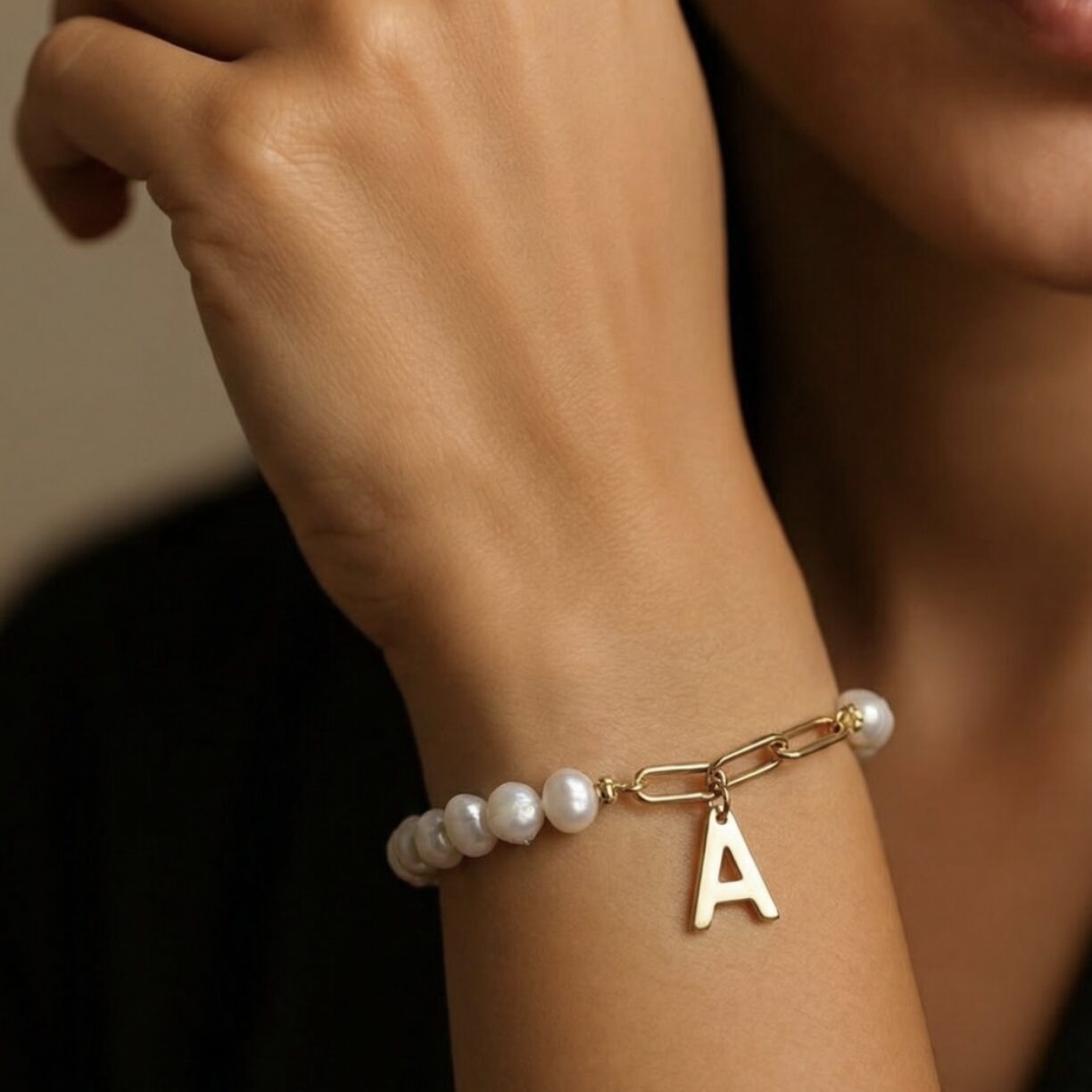 Pulsera mitad de perlas con cadena de acero inoxidable e inicial